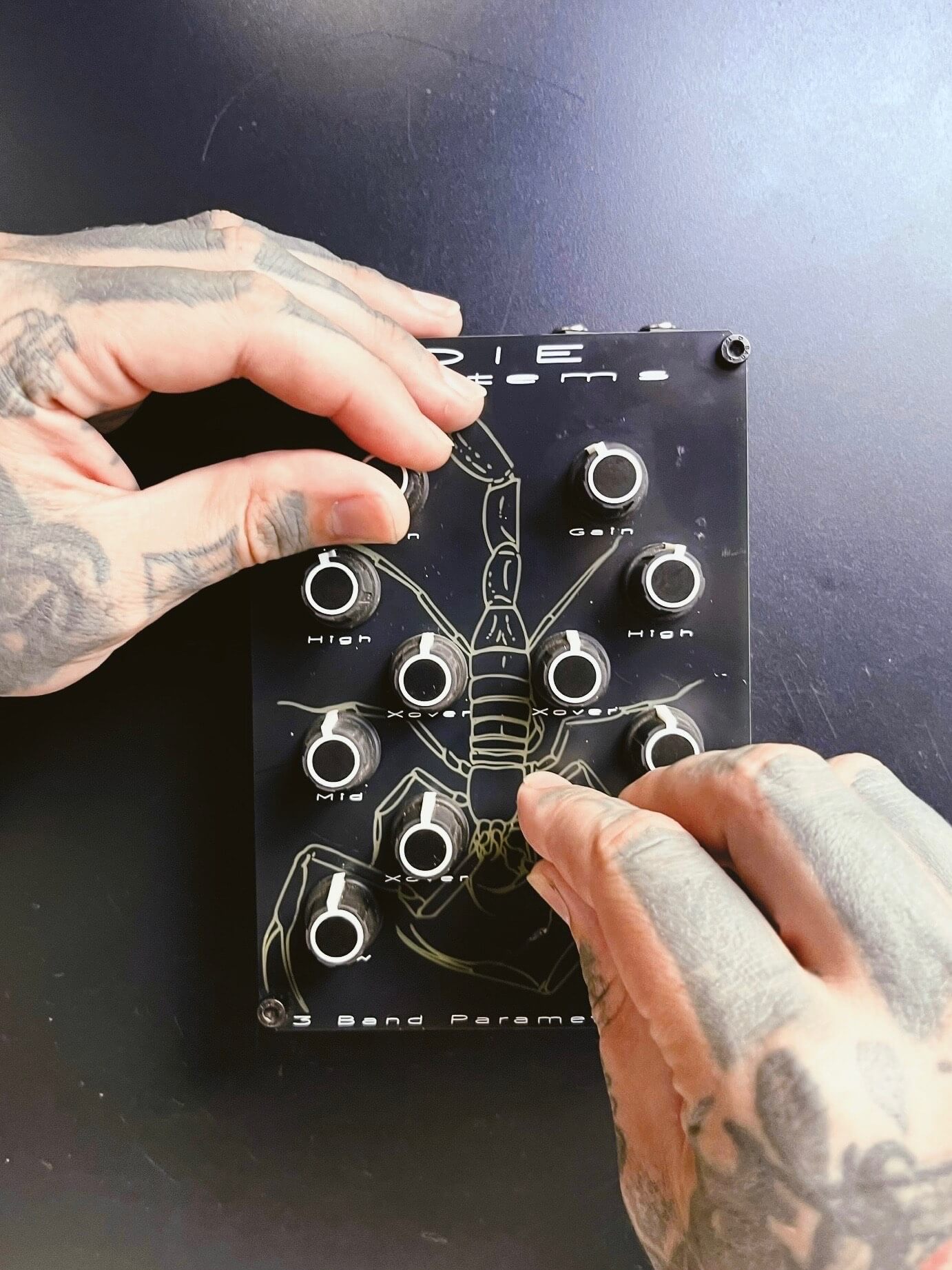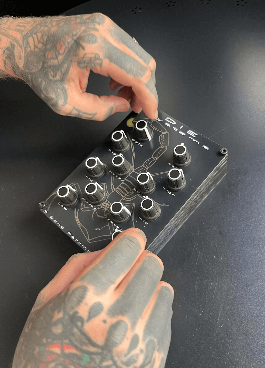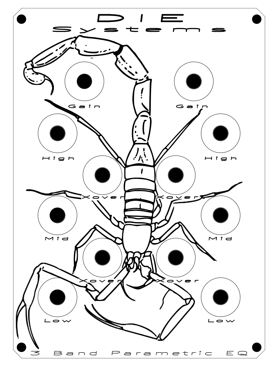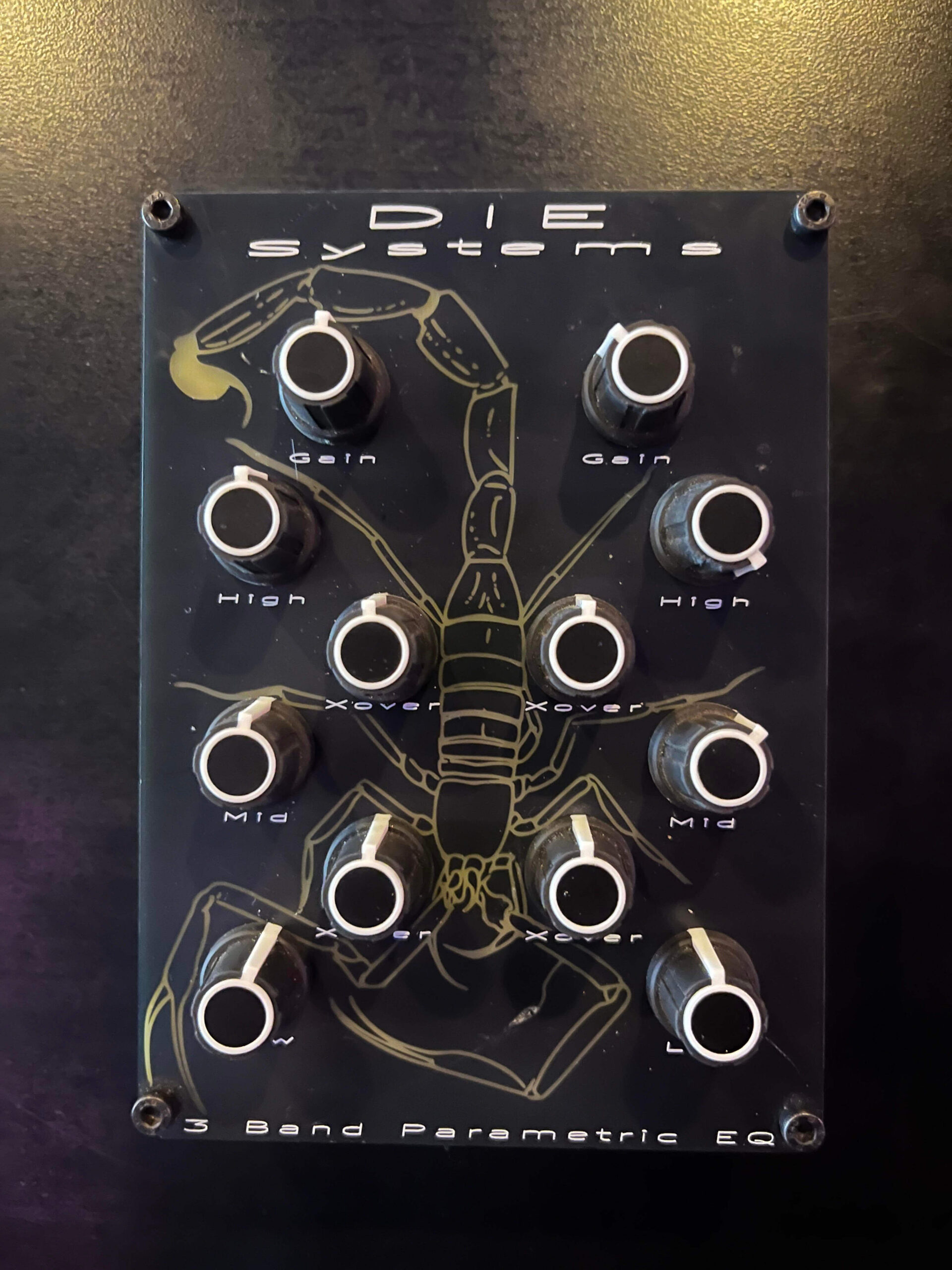 We present to you the DIE systems 3 band parametric EQ. A simple desktop EQ that lets you control 3 adjustable eq bands. It is a dual mono unit, with 2 independent analogue signal paths. Each channel has 2 filters to separate the sonic spectrum into 3 bands, has adjustable crossover controls between each band, and a post gain stage.